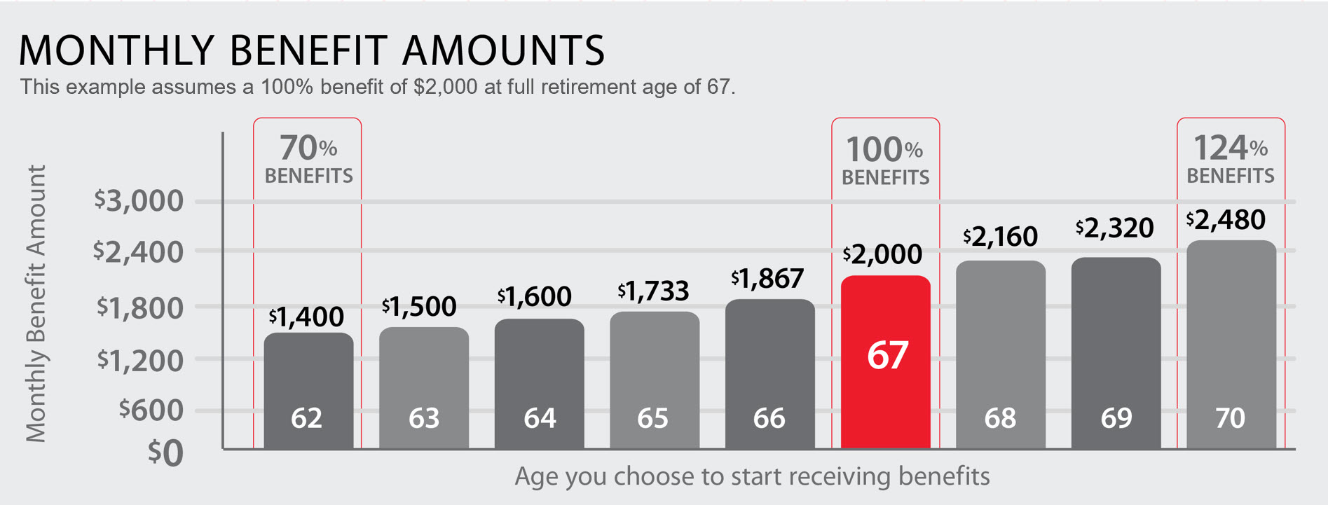 If you were born after 1960, Social Security Retirement Age (SSNRA) is 67. At 67, you can receive 100% of your Social Security benefits. However, if you decide to retire early, your benefits may be significantly reduced. Retiring at 62 instead of 67 could mean you only receive 70% of your Social Security benefit. If you decide to wait until after your Social Security retirement age, you can actually receive more per year until age 70, up to 124% of benefits.2