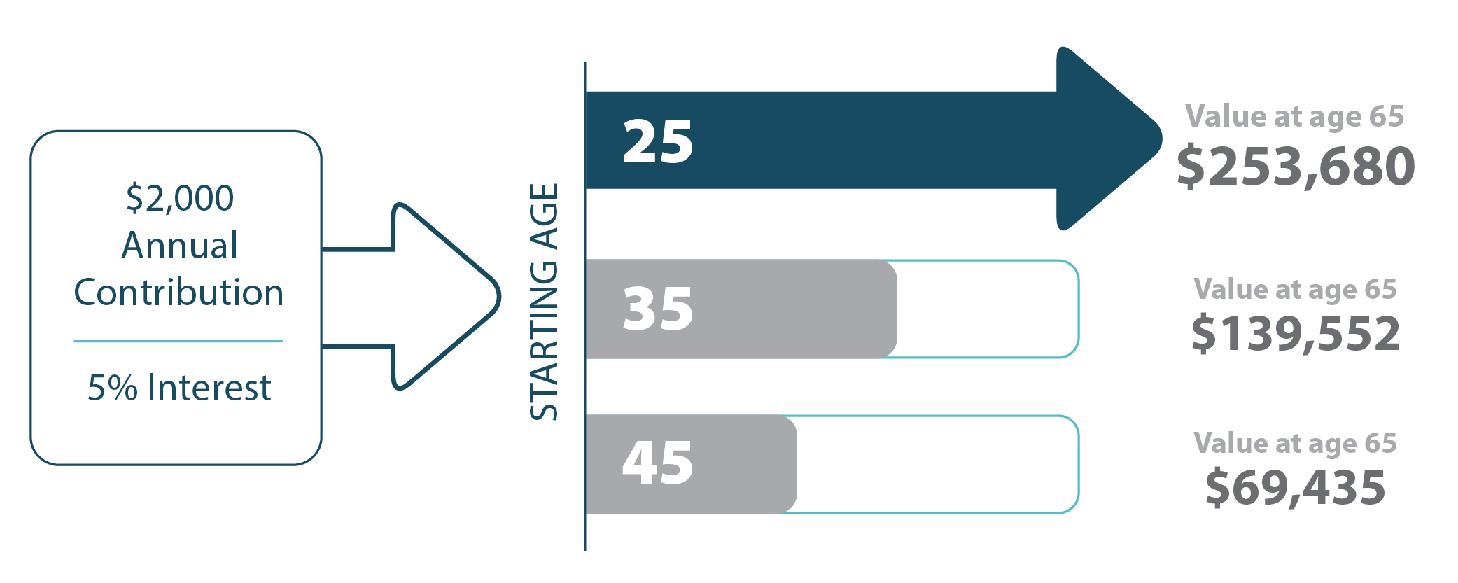 In this example, a $2,000 annual contribution - or roughly $167 a month - is growing at a hypothetical 5% rate of return. You can see the difference that time, one of the most important factors, can make on the investment.